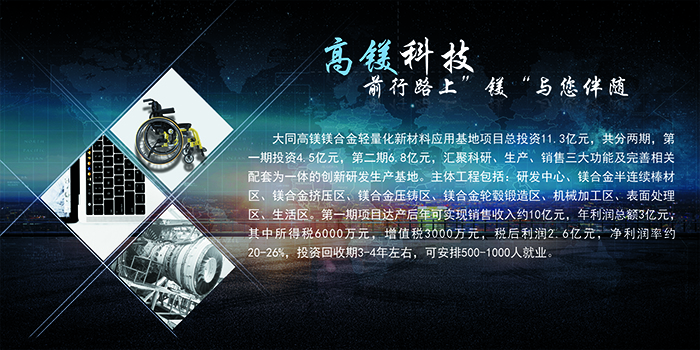 大同高鎂科技有限公司是擁有30幾年鎂合金研發(fā)、生產(chǎn)、應(yīng)用經(jīng)驗,是國內(nèi)首批的鎂合金生產(chǎn)廠家,為國家科技部掛牌的鎂及鎂合金產(chǎn)業(yè)基地、是北京市高新技術(shù)企業(yè)和中關(guān)村高新技術(shù)企業(yè),股東包括中關(guān)村發(fā)展集團,總資產(chǎn)16億元。公司堅持走產(chǎn)學(xué)研相結(jié)合的道路,依托清華大學(xué)、北京科技大學(xué)、北京有色金屬研究總院等科研院校,產(chǎn)品形成鎂合金鑄造、壓鑄、擠壓、沖壓、軋制五大板塊200多個品種,同時還配套了鎂合金半連鑄棒材生產(chǎn)、CNC精密加工、表面處理、焊接、檢測檢驗等綜合服務(wù)體系。